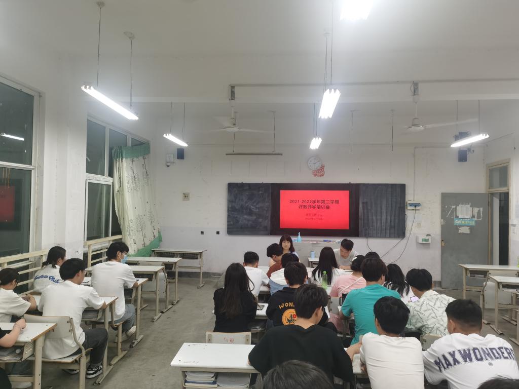 为了更好的获得教学评价信息,以改进教学水平,提高教学能力,tyc5997太阳集团于5月16日晚对员工进行了评教培训会,指导员工线上评教的方法以及如何客观公正的对每一门课作出有效评价。培训由教学办主任宁丽平主持,副经理黄猛参加活动。