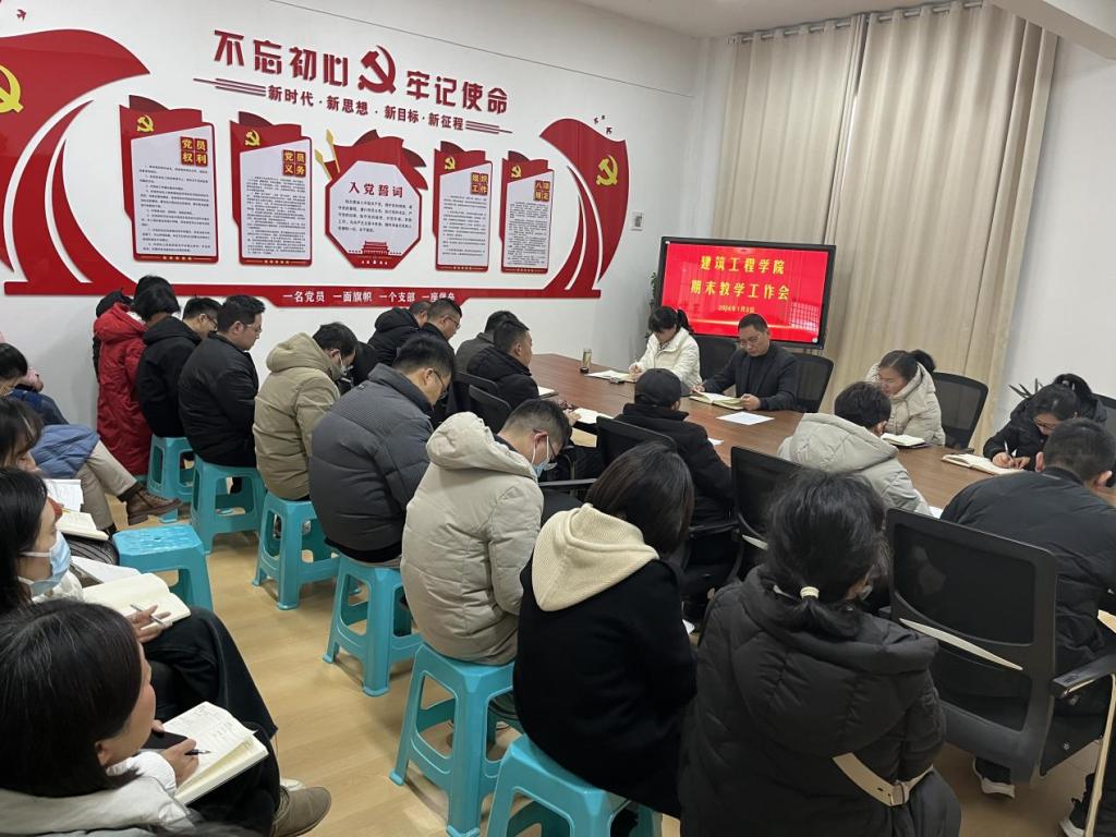 2024年1月3日,建筑工程公司在党员活动室召开了期末教学工作会议。全体教师参加了此次会议,旨在总结本学期教学工作,部署下学期的任务安排及期末考试相关事宜。