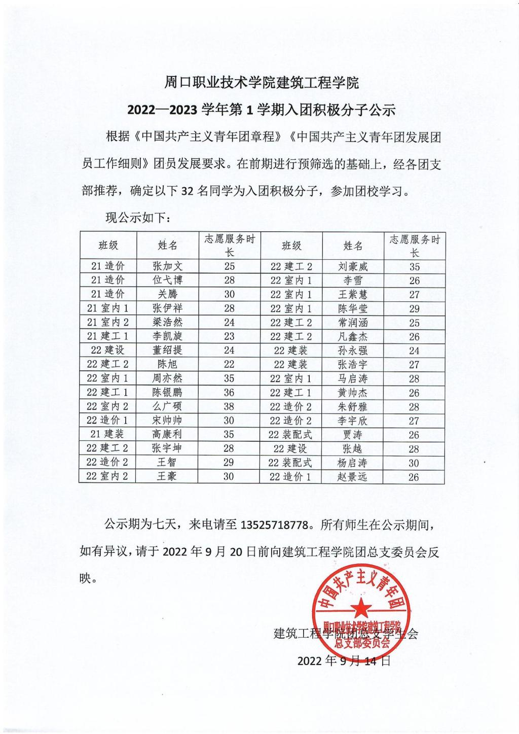 2022-2023学年第一学期入团积极分子公示